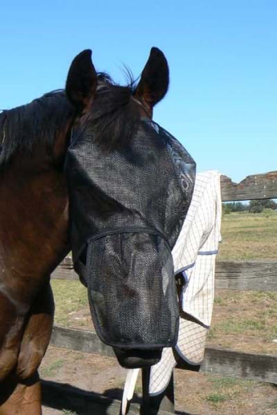 The fly mask is also available with a nose protector in either mesh or cotton and can be bound in lambswool around the brow and nose or around the full face area