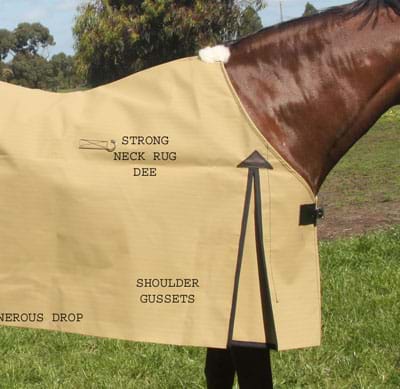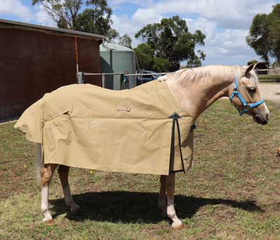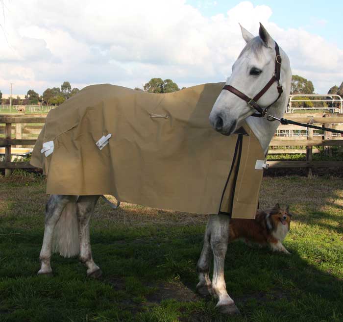 Made from Super Super Strong Australian proofed 12oz ripstop, with core spun ripstop thread. Beige colour makes this rug an excellent choice for warmer days where rain is likely.Supplied with Biothane Safety Back Leg Straps, Freedom Mover Shoulder Gussets, XL Wither fleece and a Tent Tail Flap