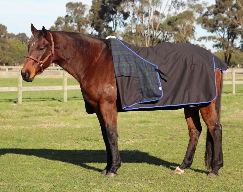 Item 4: Summer Sheet, Black check with Black Trim - MATERIAL MARKS - Summer Ripstop Sheet, standard tail flap, Quick release leg straps, Biothane front, wither fluff - RRP $90 Clearance Price $80