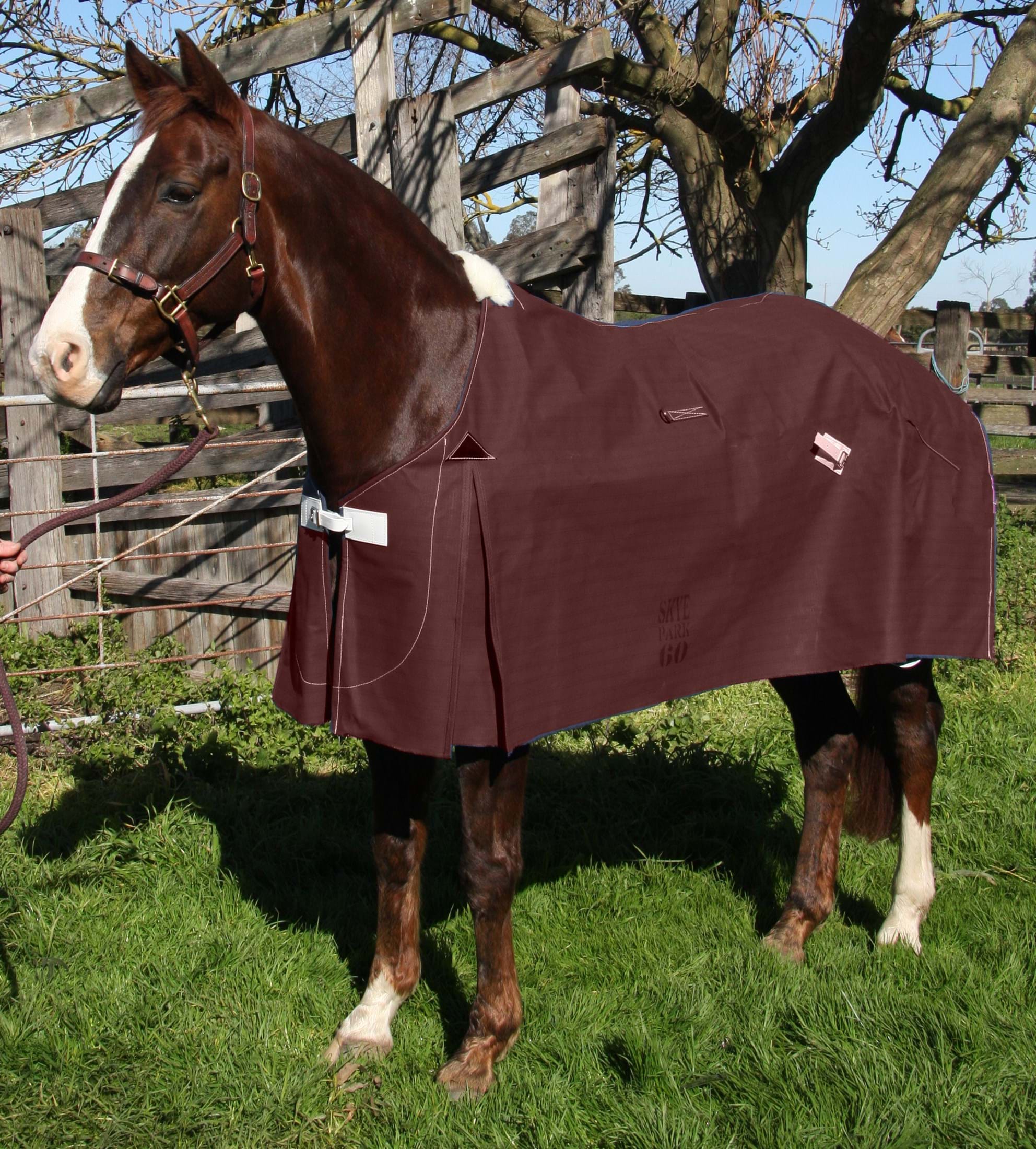 Item 3: Summer Sheet, Burgundy and Black check with Burgundy Trim - NO FAULTS - Adjsuted neckline (slightly smaller than standard 5'6" neckline) Ripstop Summer Material, standard tail flap, quick release leg straps, biothane front fittings, wither fluff - RRP $90 Clearance Pricee $80 SOLD OUT