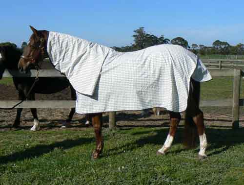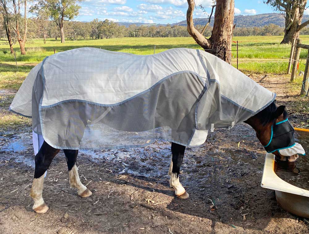 Item 8: Summer Air Neck Rug Combo - PVC MESH STYLE, not recommended for 'tough on rugs' horses (please see current range, made with combat mesh) - Summer sheet top, with PVC mesh lower panels to help keep your horse cooler, Quick Release Leg Straps, Tent Tail Flap, Biothane front fitting, Wither Fluff - RRP $250 Clearance Price $120