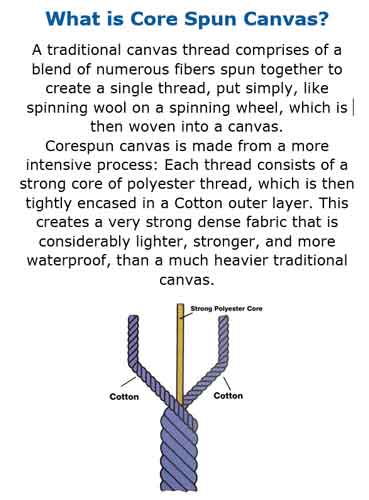 So what is Core Spun Canvas??? When the threads that are used to weave canvas are spun most Poly/Cotton canvas materials are blended and spun into a thread, similar to what you imagine a spinning wheel creating.Core Spun canvas is cotton pulp spun around a polyester thread core. These threads are then used as the ripstop threads in the Murray(approximately every 5ml) The advantage of this to the our Murray horse rug is the strength that this polyester thread gives the canvas without extra weight and thickness of an 18 or 22oz, and that the cotton around the core expands and gives better waterproofing while still maintaining excellent breathability.