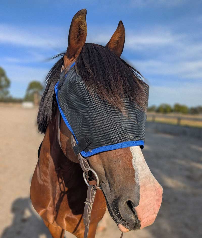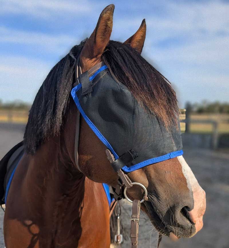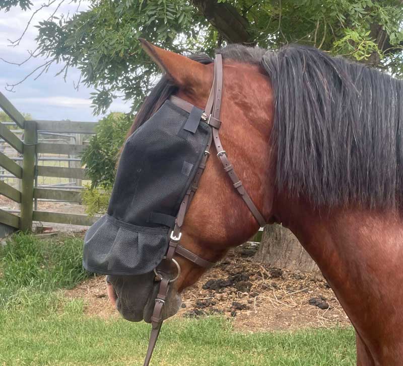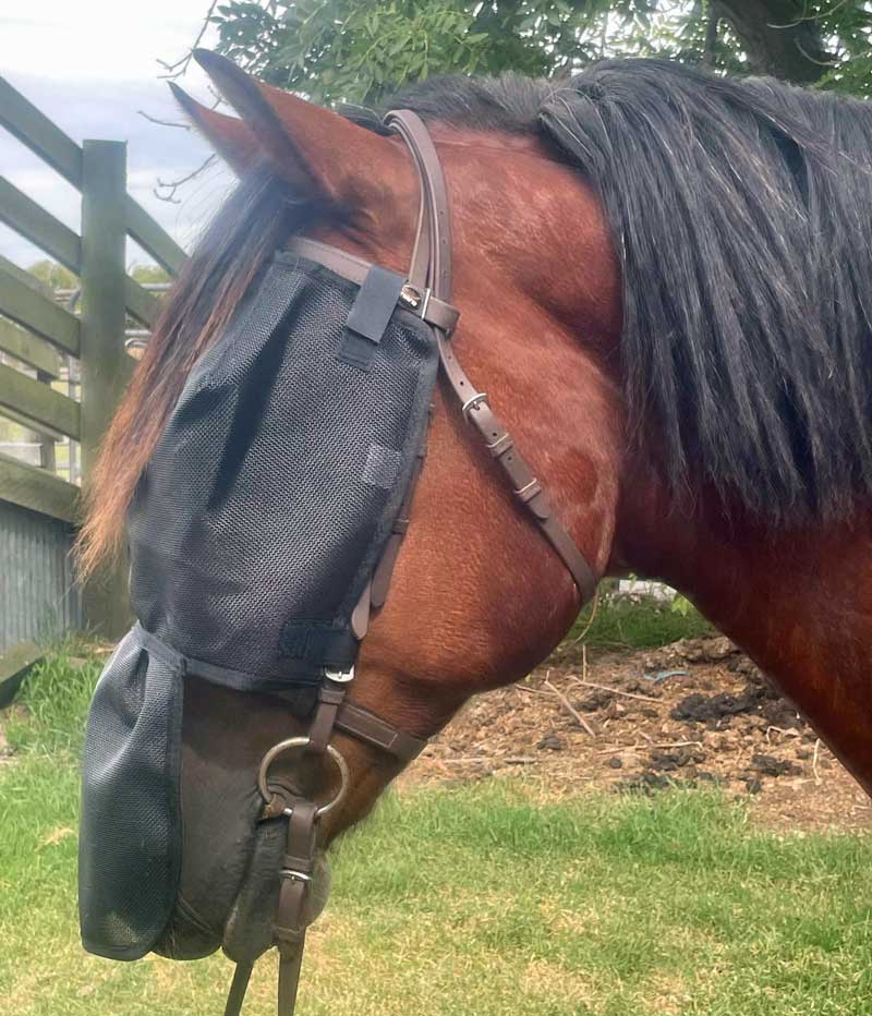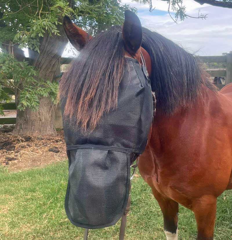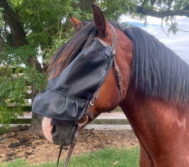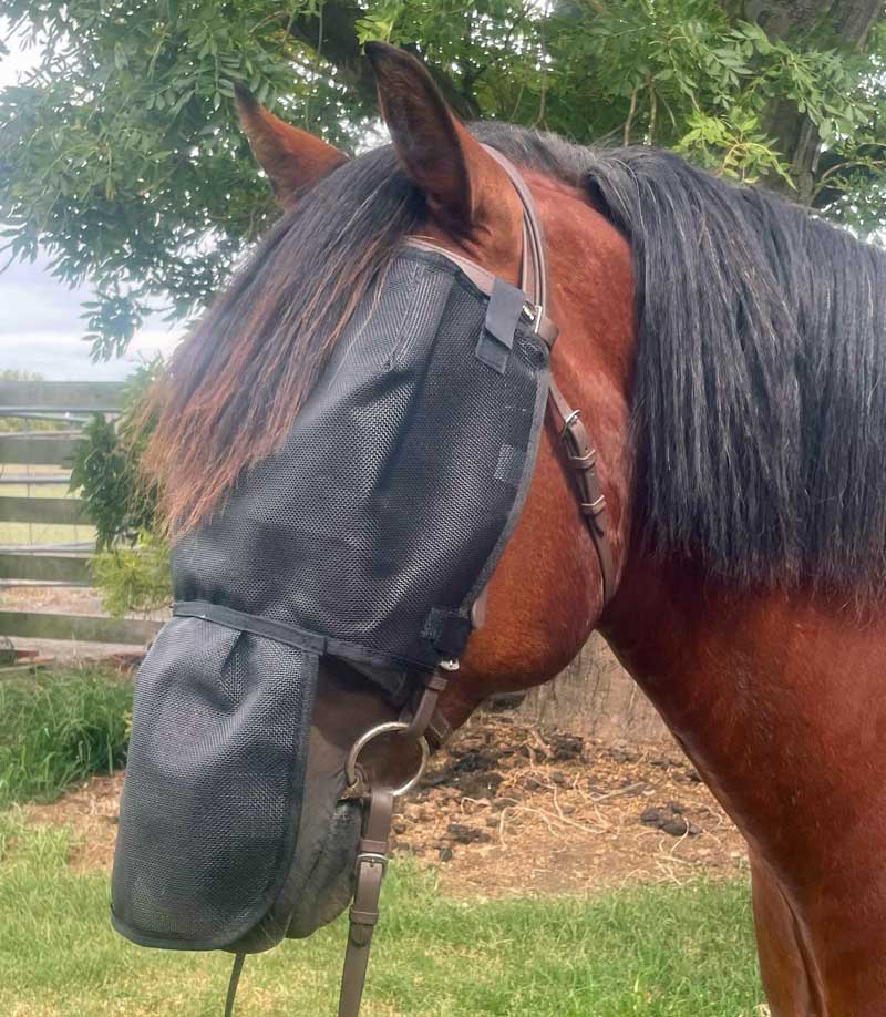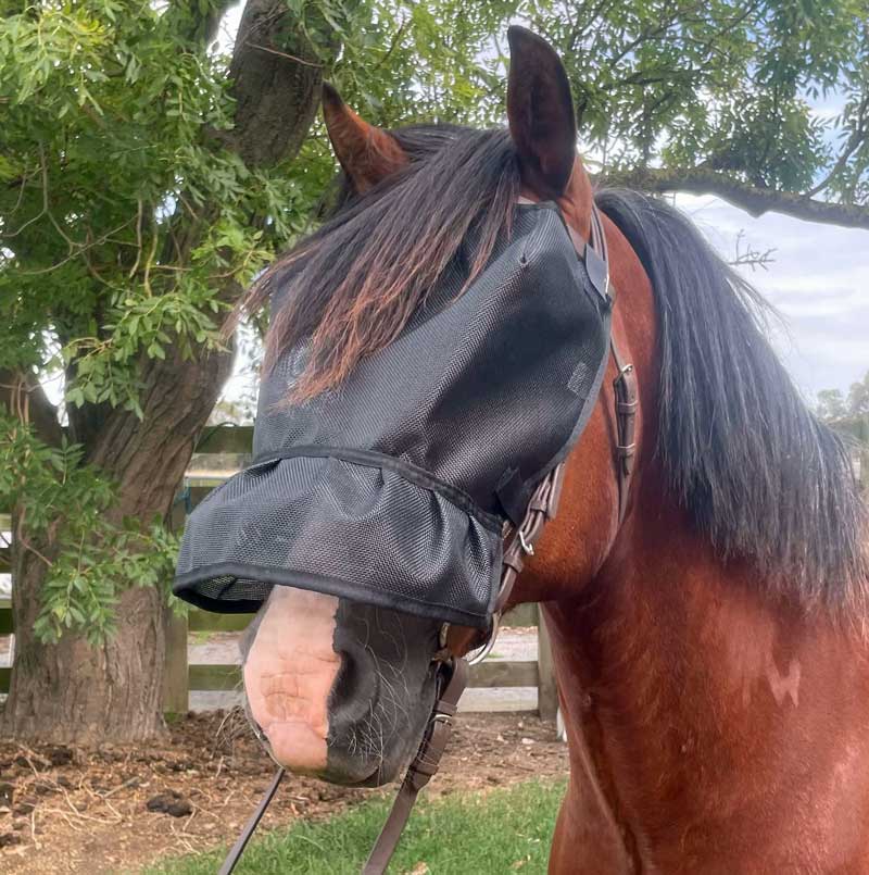 Our new ride-in flymask protects your horse's precious eyes (and nose if needed)