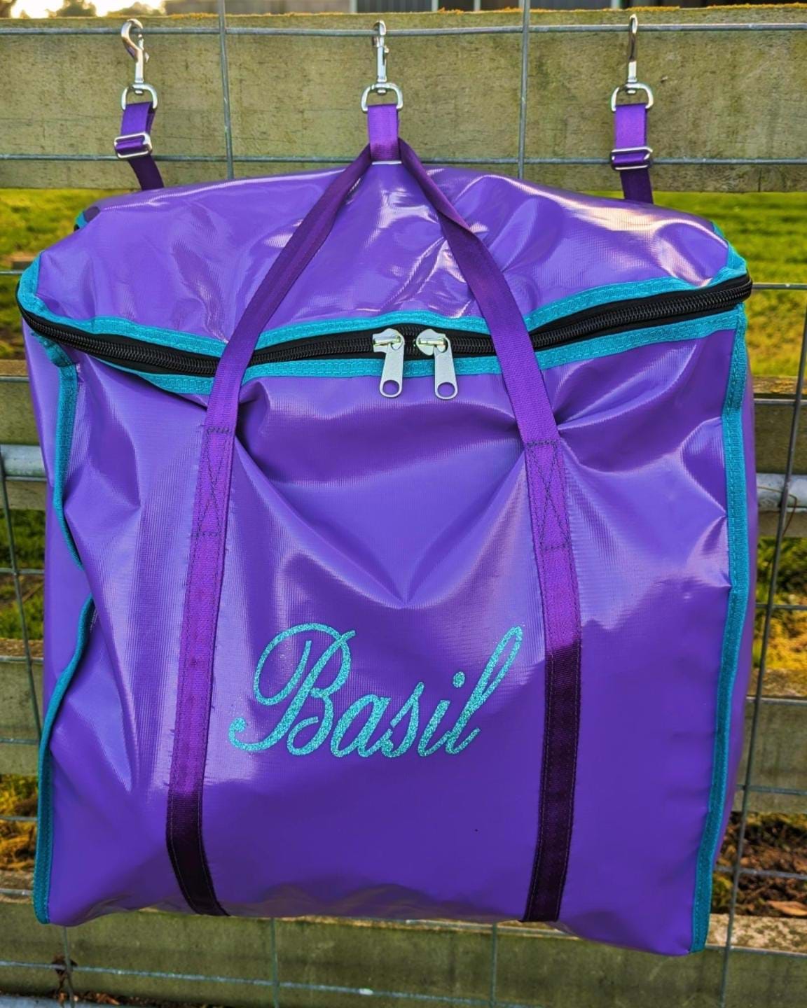 Made from PVC with double zip closure that you can add a small padlock to protect your posessions. Adjustable clips to attachemet to stable.