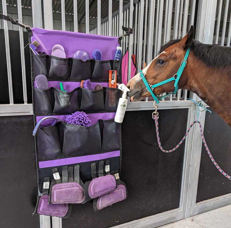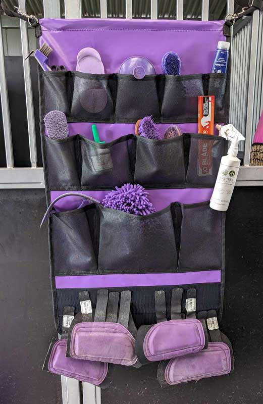 Made from strong PVC with various sized mesh pockets for convenient storage of grooming equipment, brushes, combs, sprays and sponges. With Strong Velcro at the base for easy boot storage/airing or with an extra row of pockets (your choice)